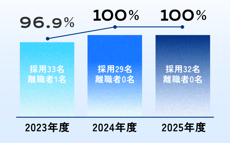 新卒入社3年の定着率   98.9 % (3年平均)